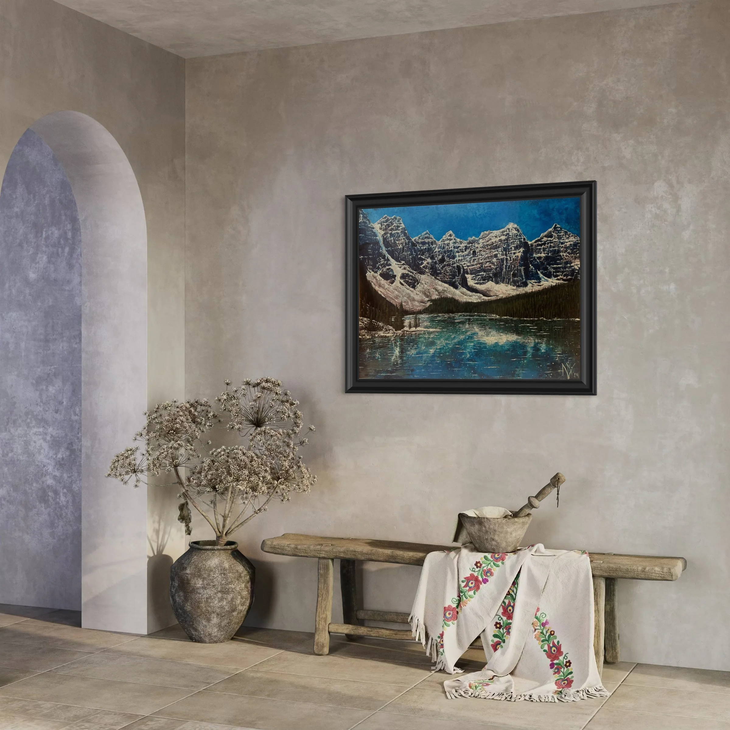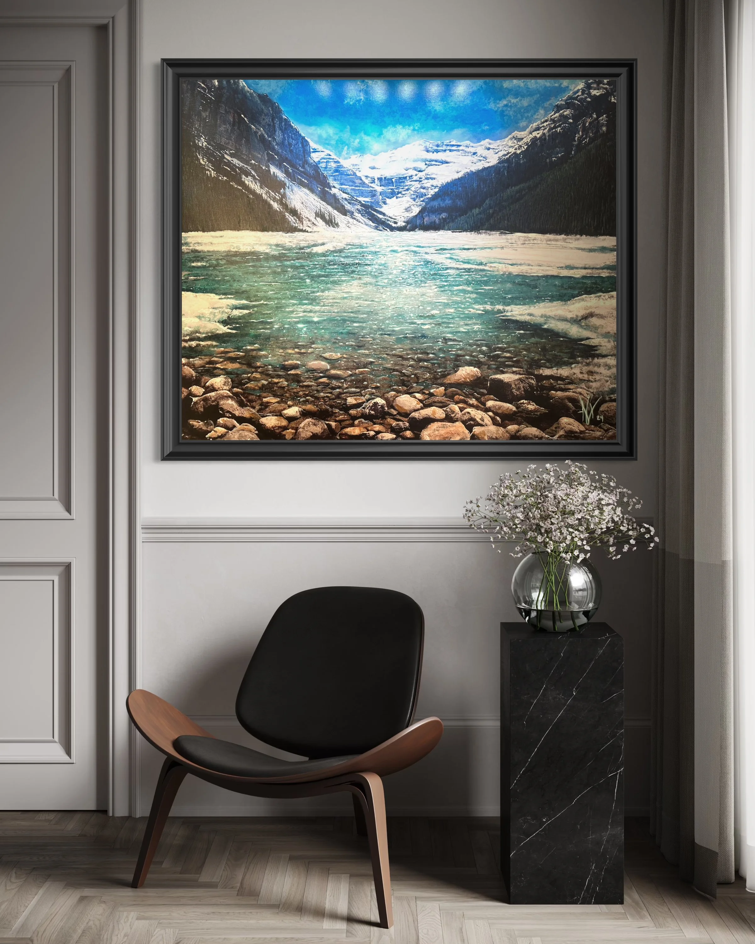 This painting showcases Lake Moraine’s beauty, with clear turquoise waters mirroring the Canadian Rockies’ snowy peaks and pines under a soft blue sky, blending nature’s tranquility and majesty.