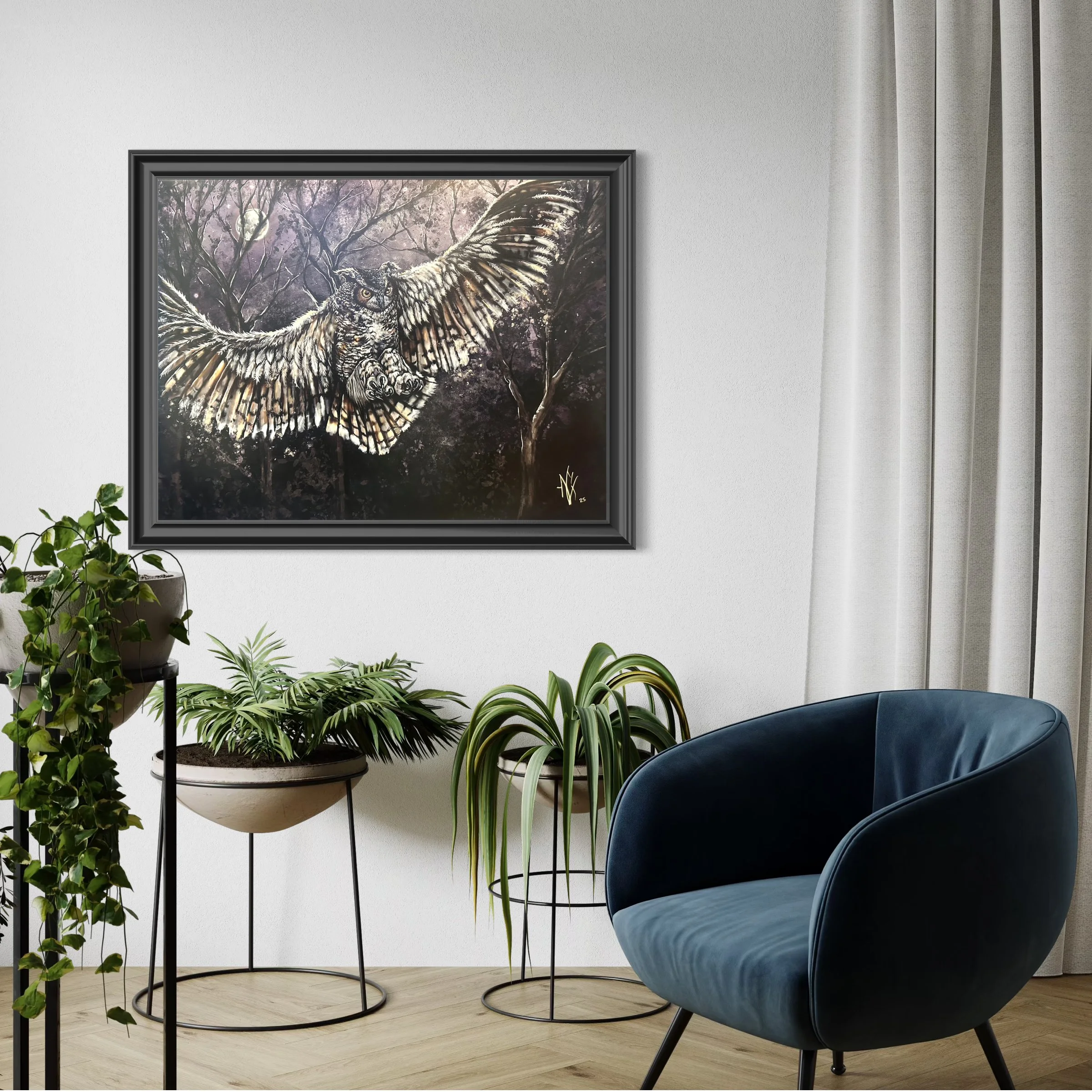 An owl mid-swoop, its wings spread under the moon's glow, talons extended towards its prey. The scene, bathed in a twilight glow, showcases the silent, deadly beauty of nature's hunter.