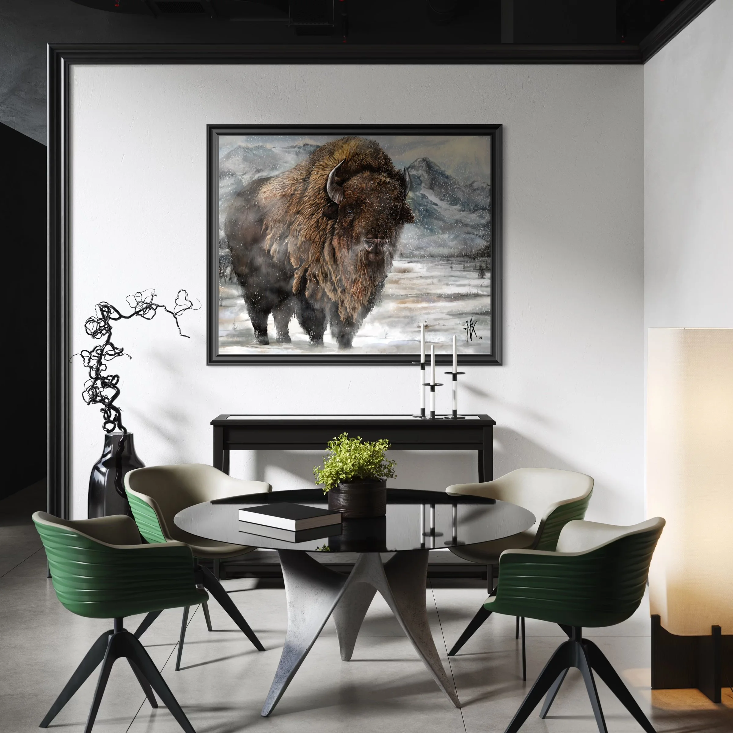 A lone bison moves through a snowy mountain pass, its sturdy form dusted with snow, eyes showing resilience. Peaks fade into mist under a faint sun, the painting capturing the wild’s enduring spirit.