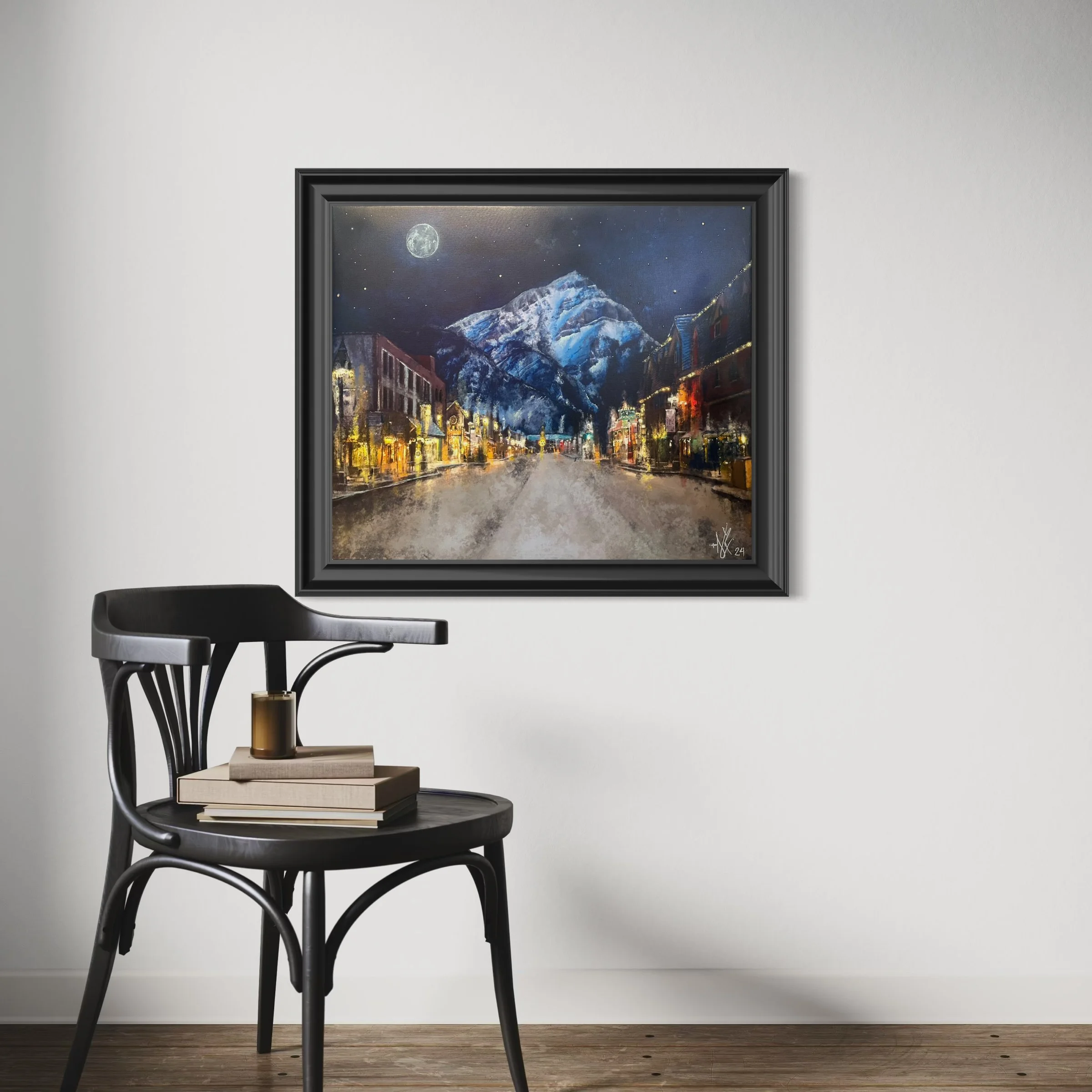 This painting depicts Banff at twilight, with warm town lights glowing against snowy streets and the Canadian Rockies. A golden sunset fades to indigo, blending nature’s majesty with cozy charm.