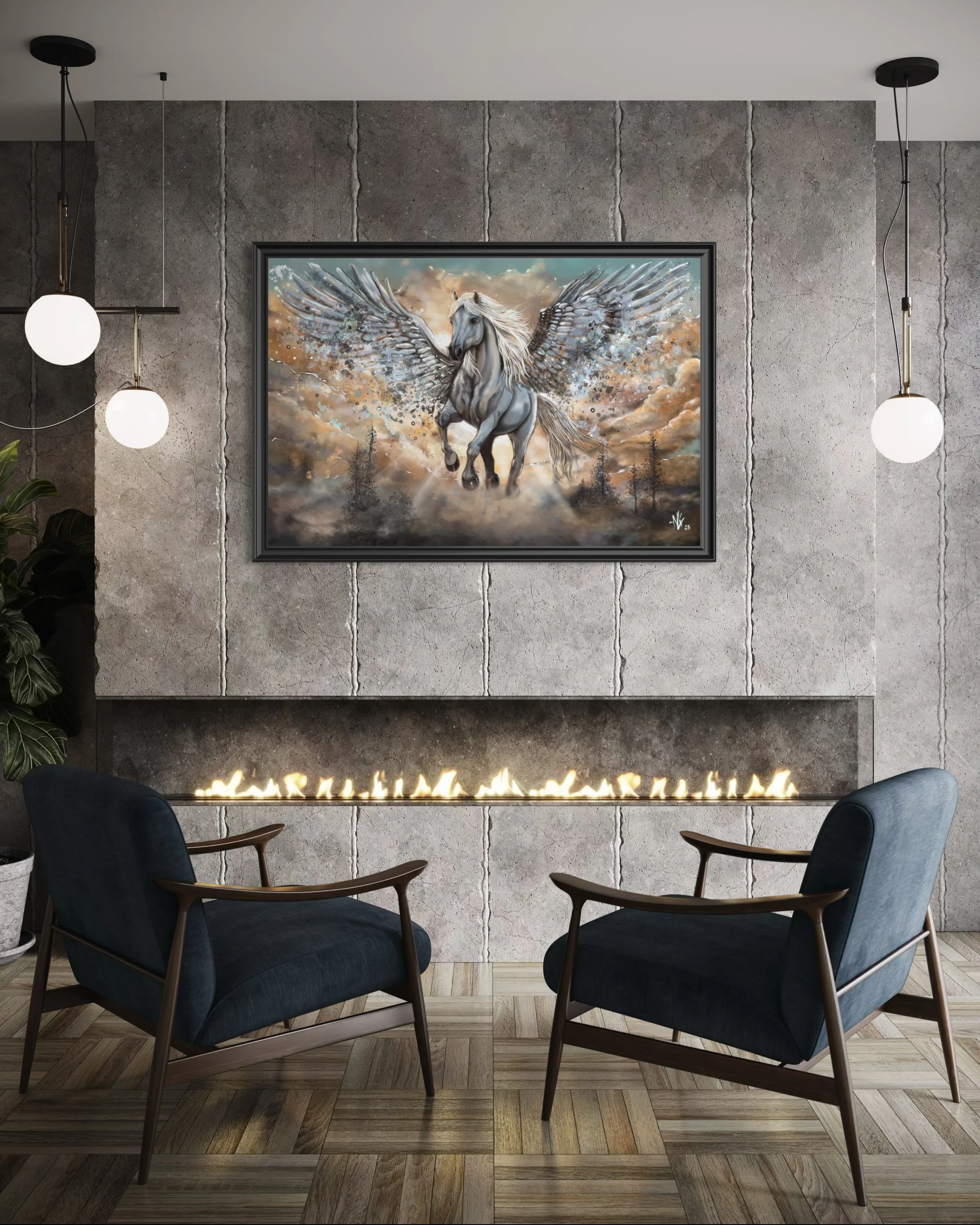 This piece portrays a powerful winged horse bursting through swirling clouds, its presence commanding the sky with both grace and force. Light fractures and splashes around it, giving the scene an ethereal, almost explosive energy as if the creature is emerging from another realm. The muted landscape below contrasts with the luminous wings, emphasizing the sense of ascension and otherworldly strength.