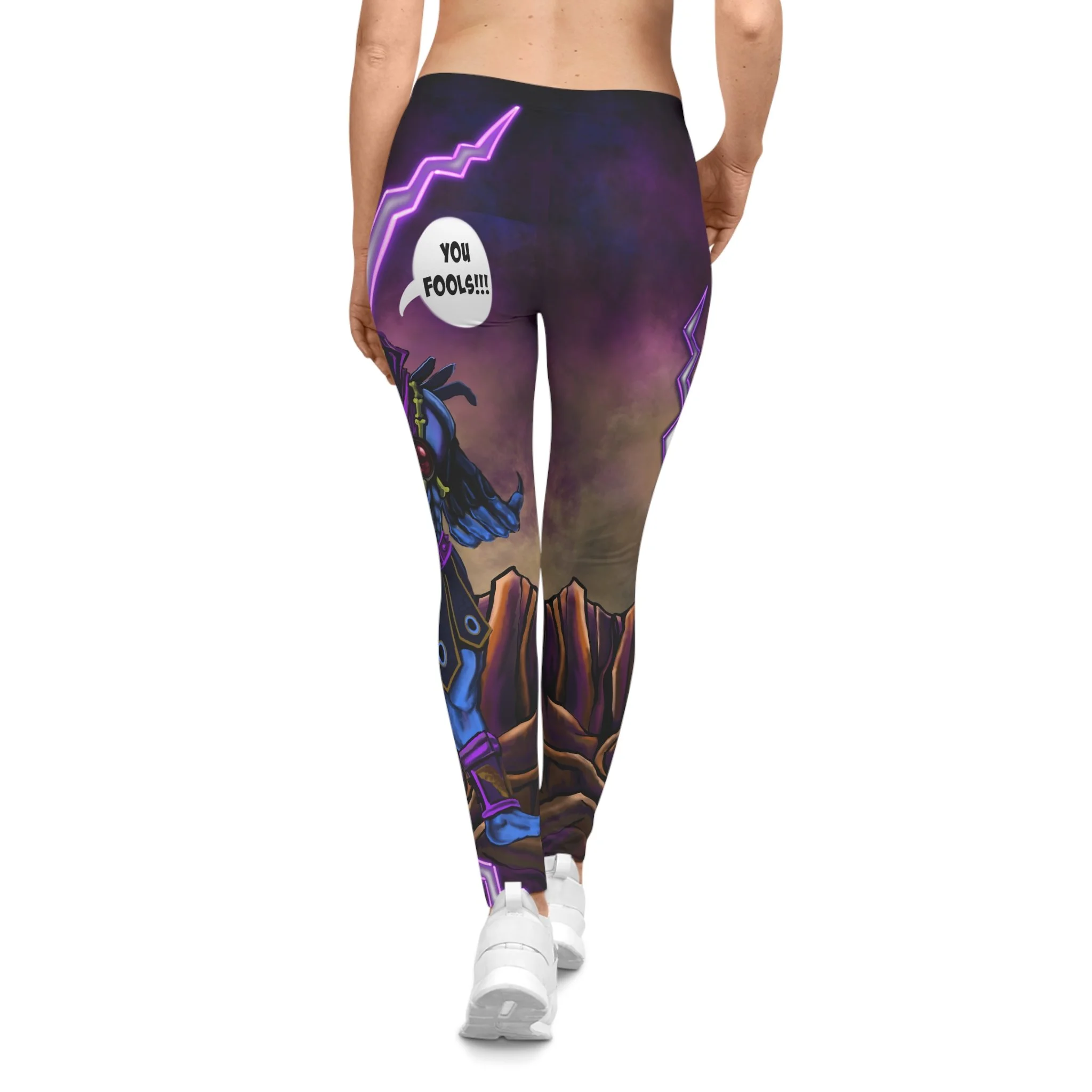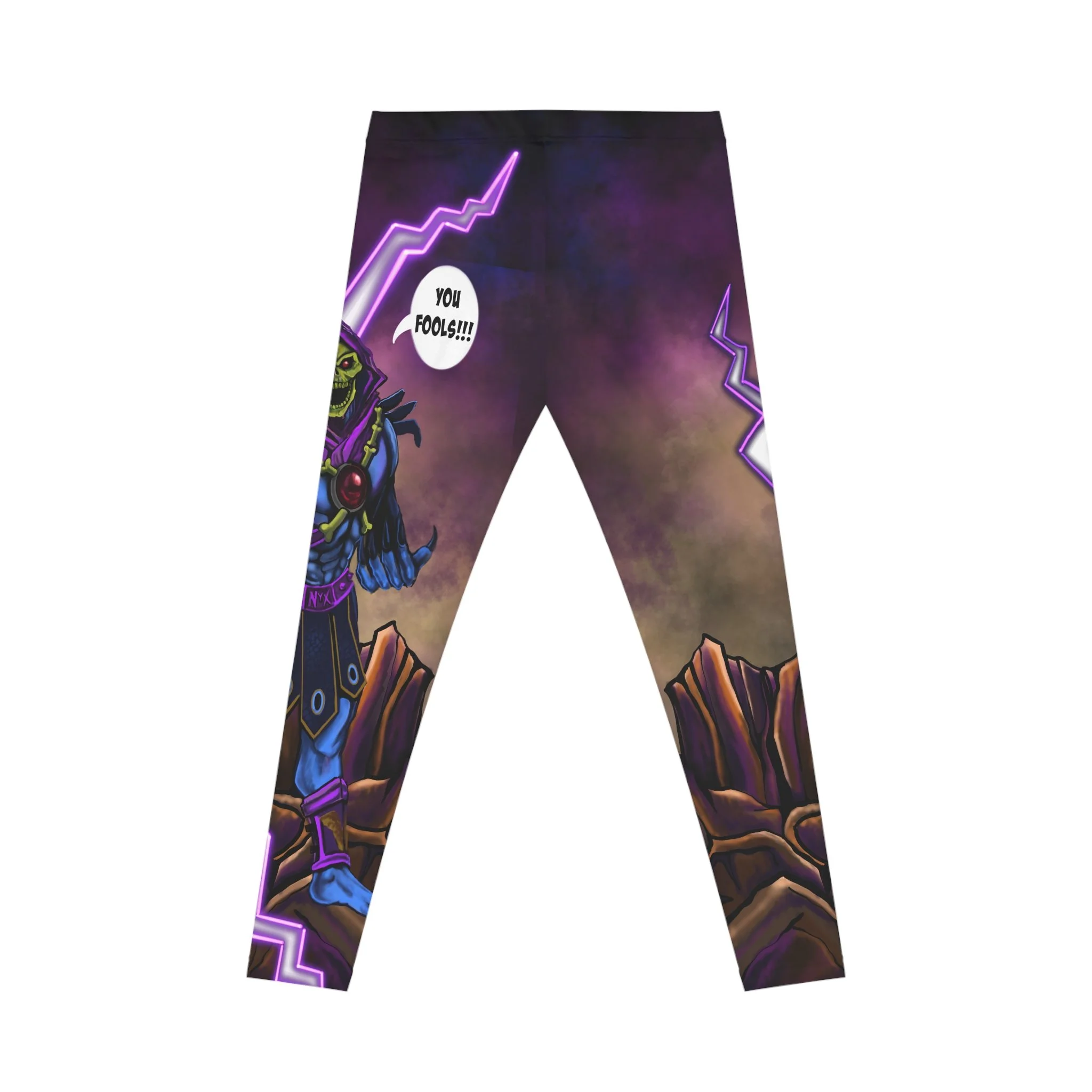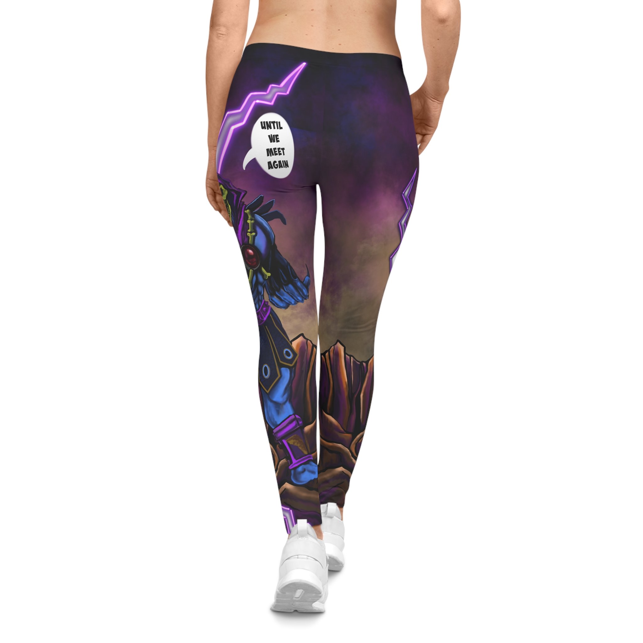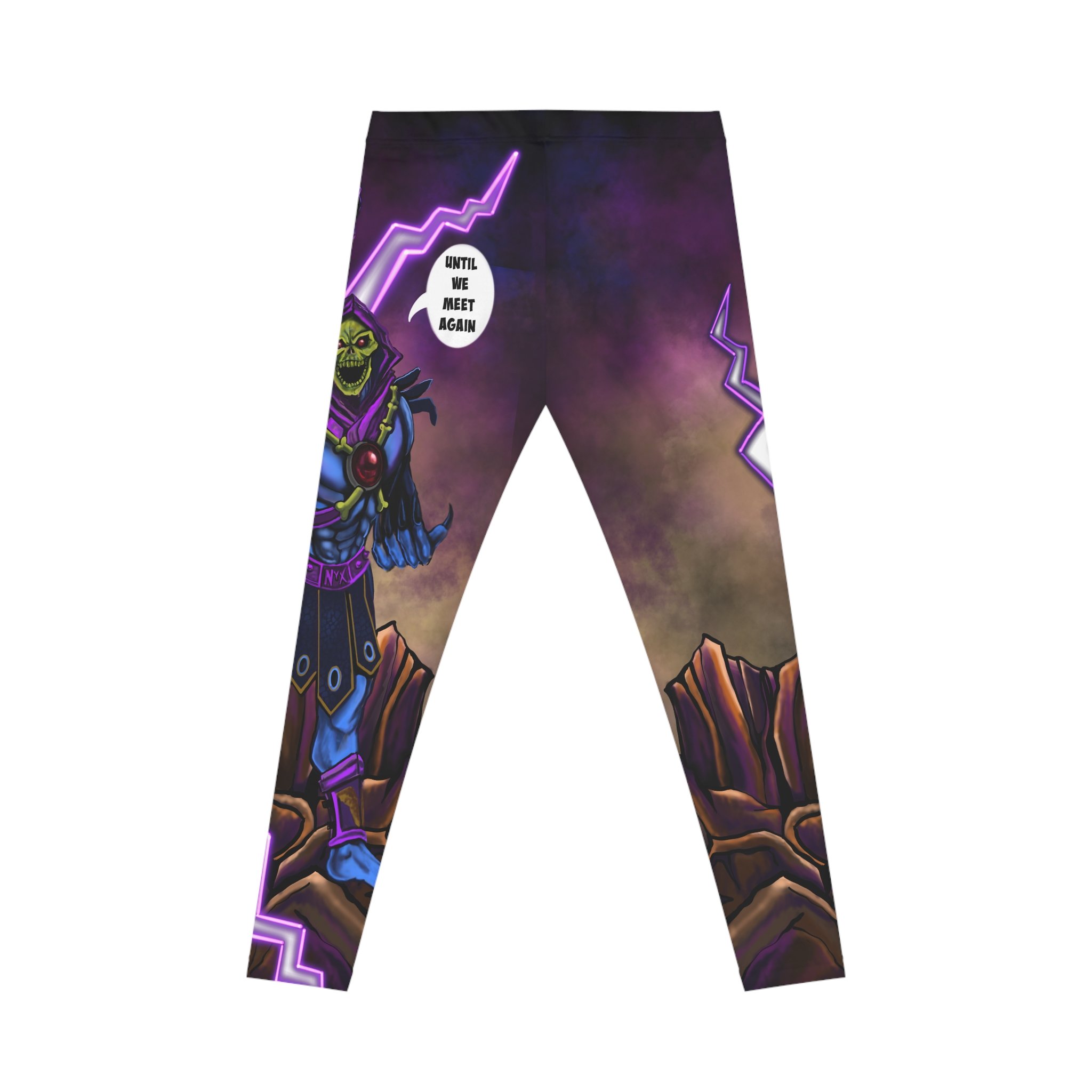 These Skeletor "Until We Meet Again" leggings are the ultimate bold, meme-fueled activewear for fans of the iconic villain from He-Man!Featuring a stunning full-print design of Skeletor in his classic menacing pose, surrounded by dramatic purple lightning bolts, swirling cosmic energy, and a rugged Eternian landscape backdrop. The highlight? His legendary catchphrase "UNTIL WE MEET AGAIN" blasts out in a bold white speech bubble right on the back hip—perfect for that dramatic exit vibe (or just dropping truth bombs at the gym).